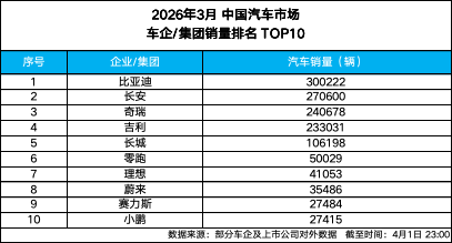 4 月 1 日,比亚迪发布 2026 年 3 月产销数据,单月总销量达300222 辆,强势突破 30 万辆大关,斩获中国车企销量冠军,并连续 58 个月蝉联中国新能源汽车销量冠军,持续稳固行业龙头地...