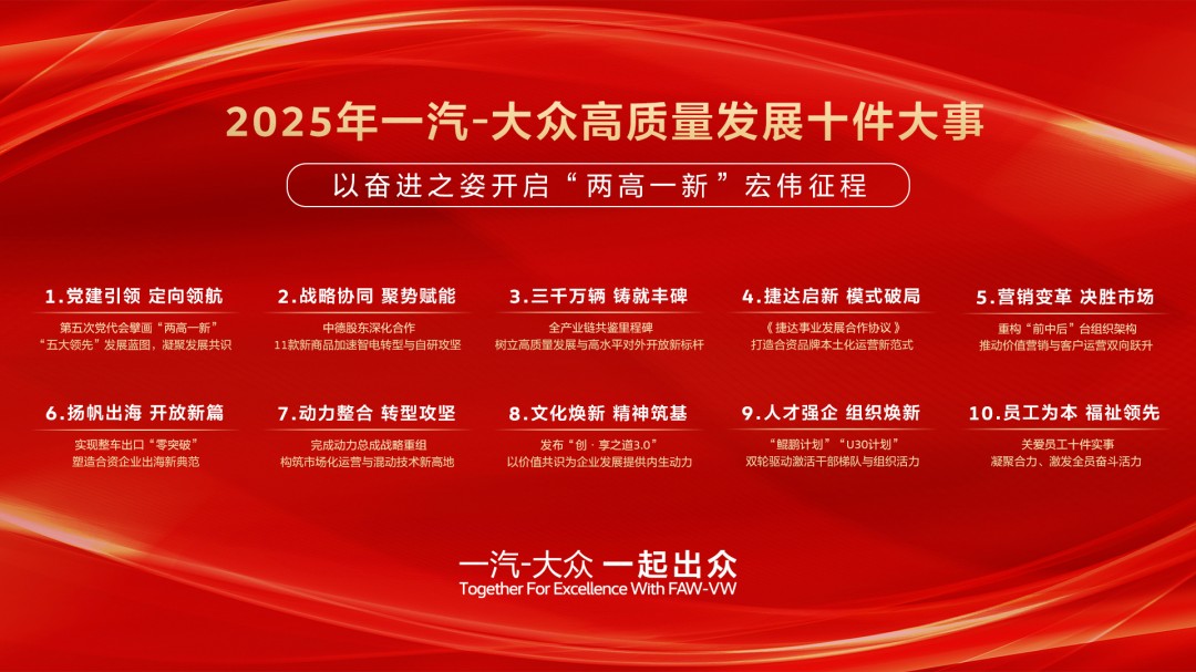 回望2025年,一汽-大众秉持产业报国初心,勇担央企合资企业使命,实现了稳健经营与高质量发展。站在“十四五”与“十五五”交汇的历史节点,一汽-大众以“十件大事”为笔,擘画了面向未来的崭新蓝图,为企业长...