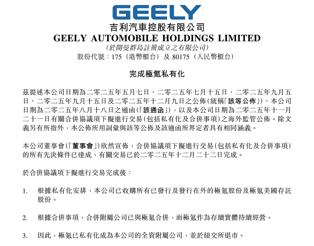 12月22日,吉利汽车控股有限公司(0175.HK)(简称“吉利汽车”)发布公告,宣布已正式完成极氪智能科技控股有限公司(简称“极氪”)私有化及合并事项的交易,极氪已成为吉利汽车的全资附属公司,并于纽...
